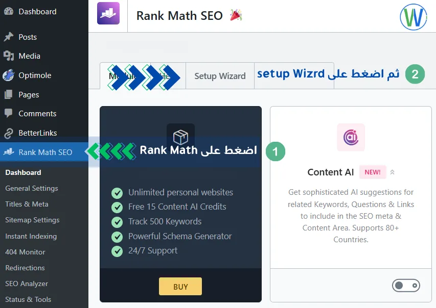 اضغط على Rank Math ثم اضغط على Setup Wiazrd